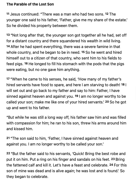 If you’re unfamiliar with the parable of the Prodigal Son told by Jesus, or it’s been a long time since you’ve heard it, here’s an excerpt in the photo below taken from Luke 15:11–24.
